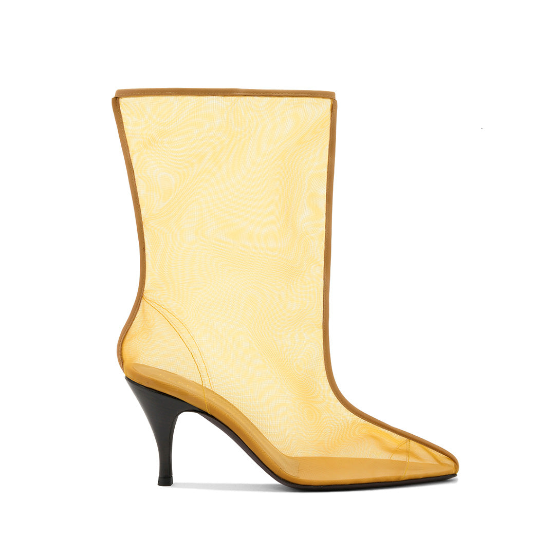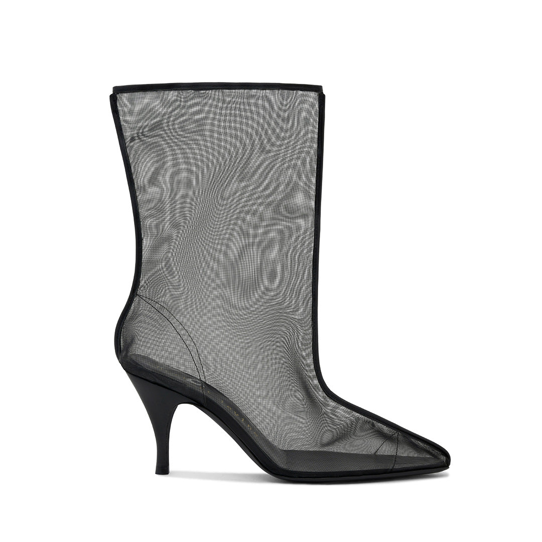 The Drawing A Blank over-the-knee boot combines translucent mesh and piping to form a graphic upper. A trompe l’oeil effect emerges as the piping mimics a two-dimensional boot sketch in profile, while the sheer mesh allows the wearer’s silhouette to define the form. From every angle, a new perspective unfolds, inviting you to direct the story.