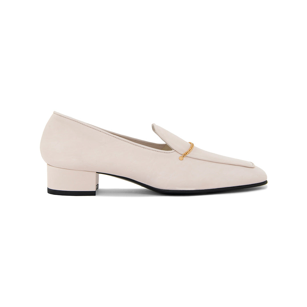 This soft square toe loafer features a subtle mini chain detail and a 30mm heel, crafted from supple, unlined materials that gently hug your feet. Timeless, functional and elegant, this style easily complements any look. For those looking for a minimal look this style is also offered without hardware.
