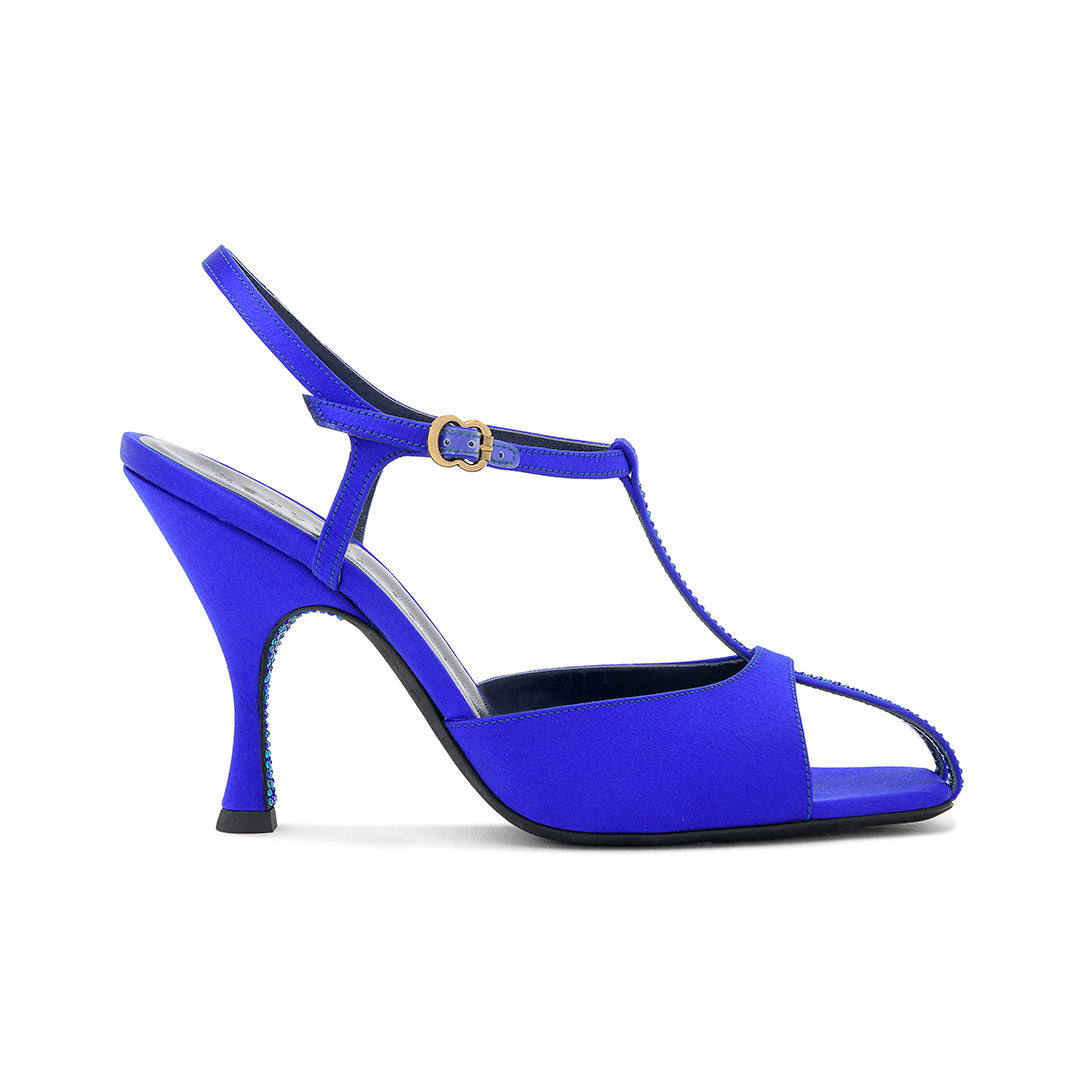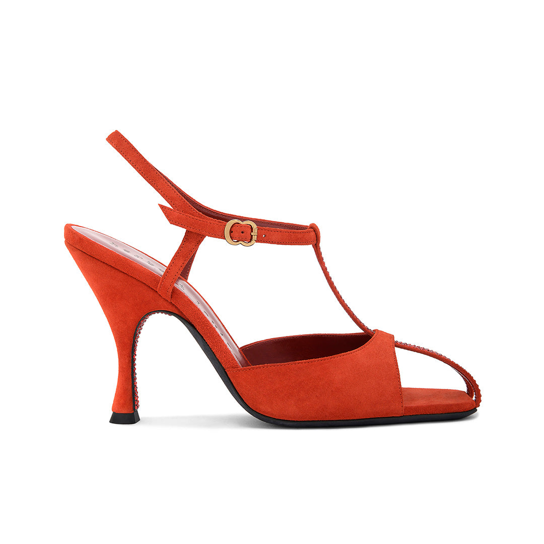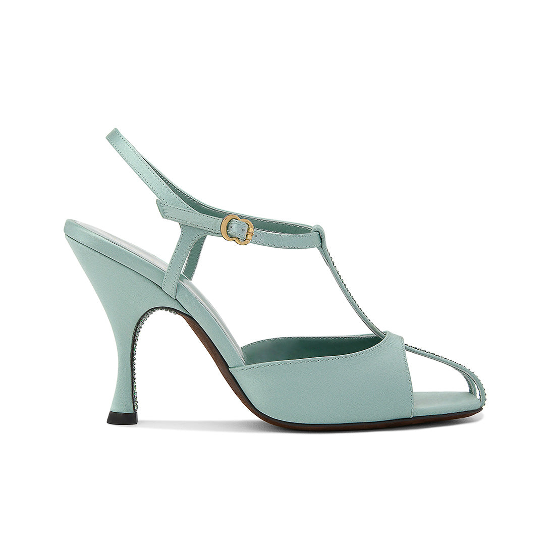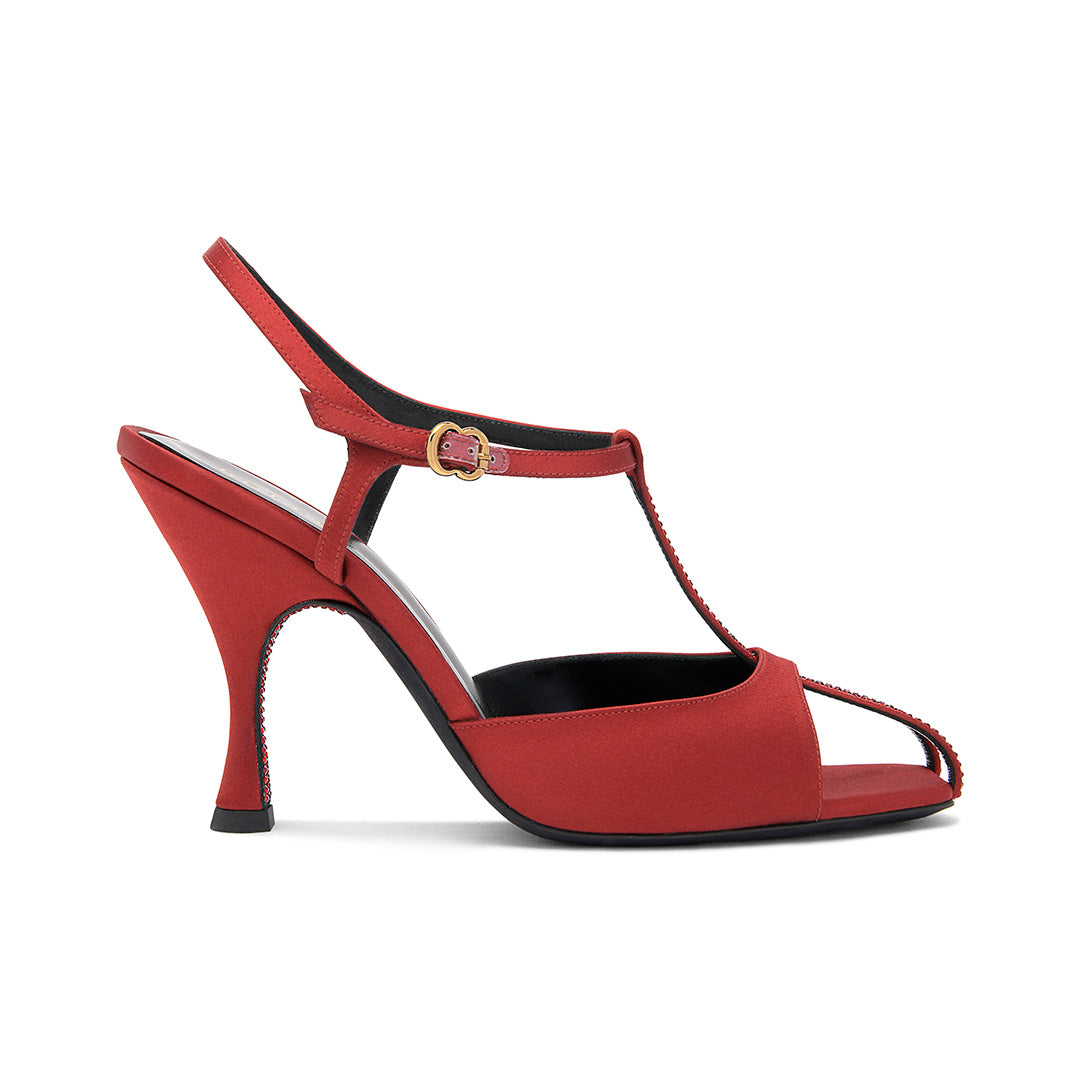 Inspired by Beth Levine’s iconic spirit, this T-strap design exudes cinematic glamour. The 95mm flared heel offers poised support while sculpting a sinuous silhouette. Subtle crystal accents hidden beneath the heel and set along the T-strap catch the light with quiet brilliance. An effortless way to lend sophisticated character to any ensemble.