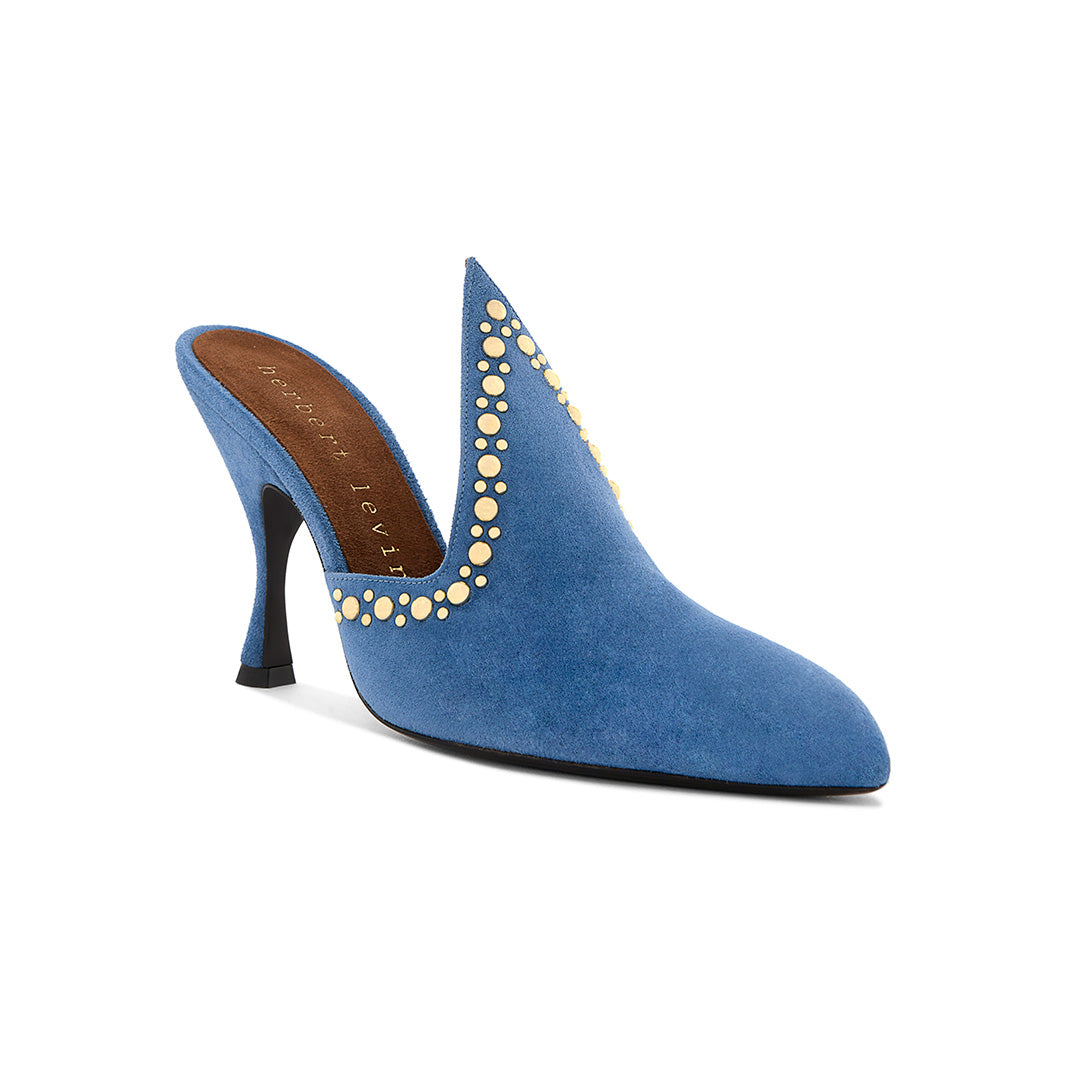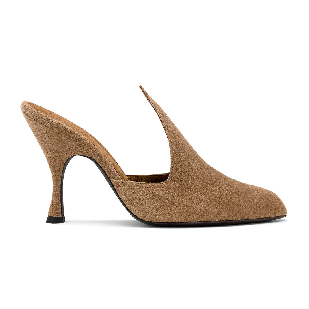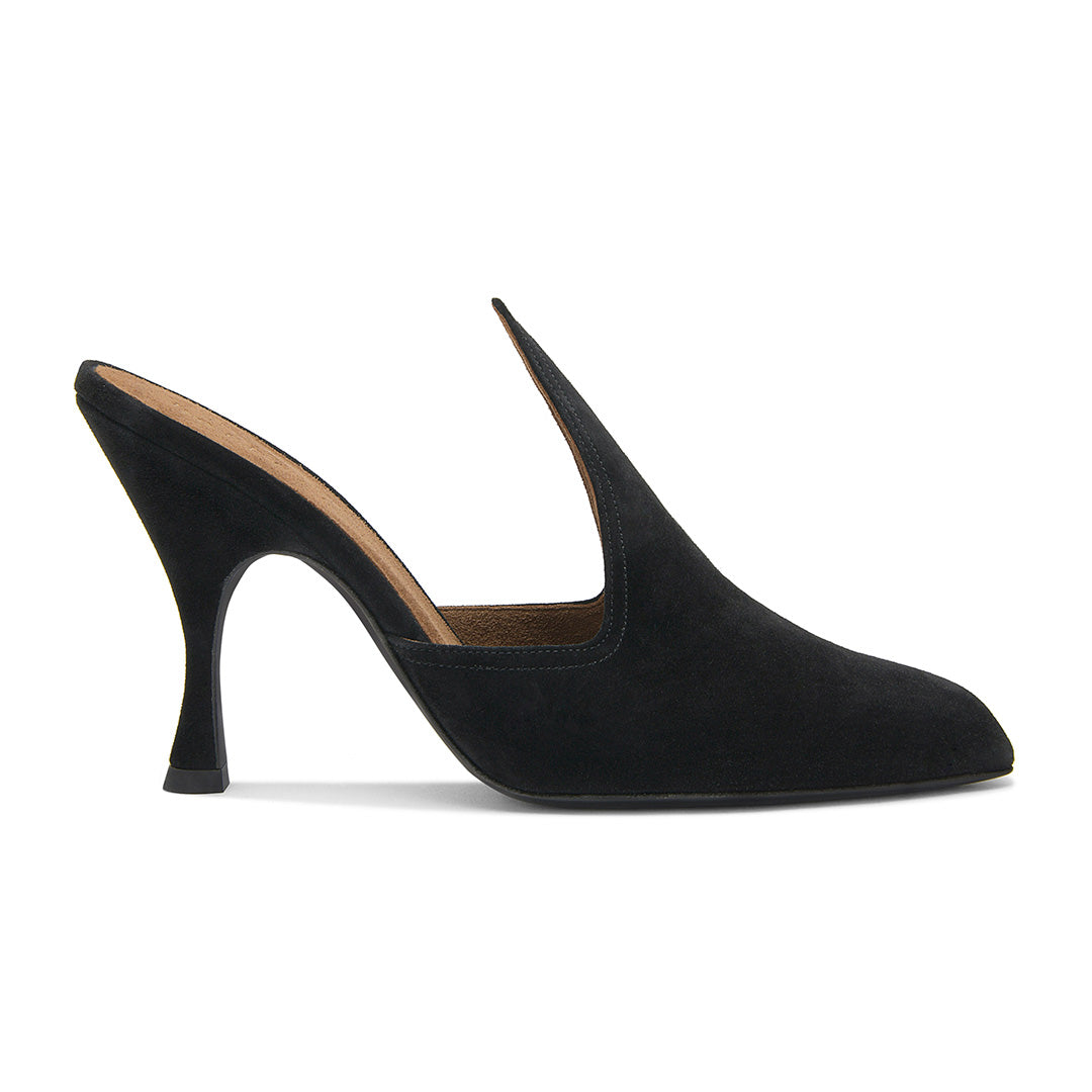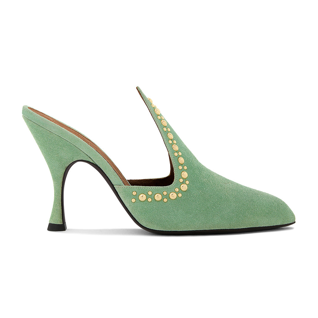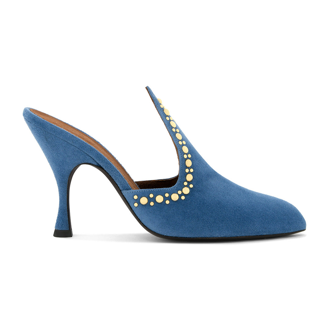 The Old Flame Mule features a minimal upper that rests elegantly against the foot, creating a refined, understated profile. A softly flared heel and supple materials bring ease to the silhouette while maintaining a polished, chic sensibility. Offered in both a studded cabochon version and a clean, unadorned finish, each iteration is defined by a strong, cinematic presence.