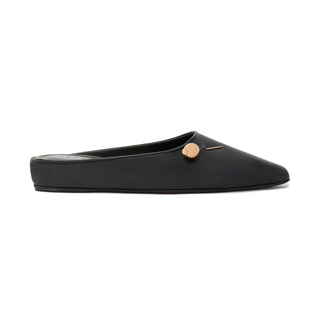 A refined and witty take on the common house slipper, this style is the new everyday essential. Featuring a 30mm wrapped wedge and padded insole, feel relaxed wherever you go. The gold removable “HL” pin hardware adds a sophisticated touch.