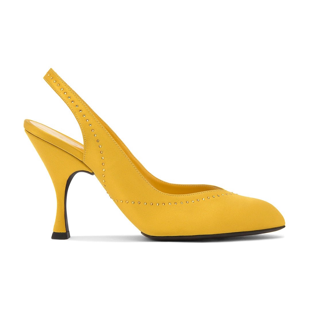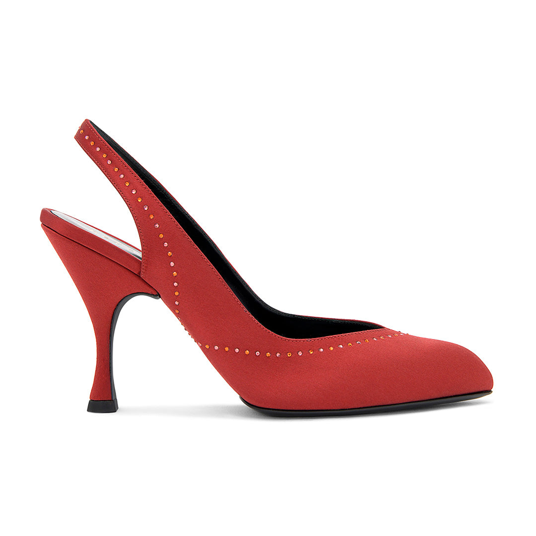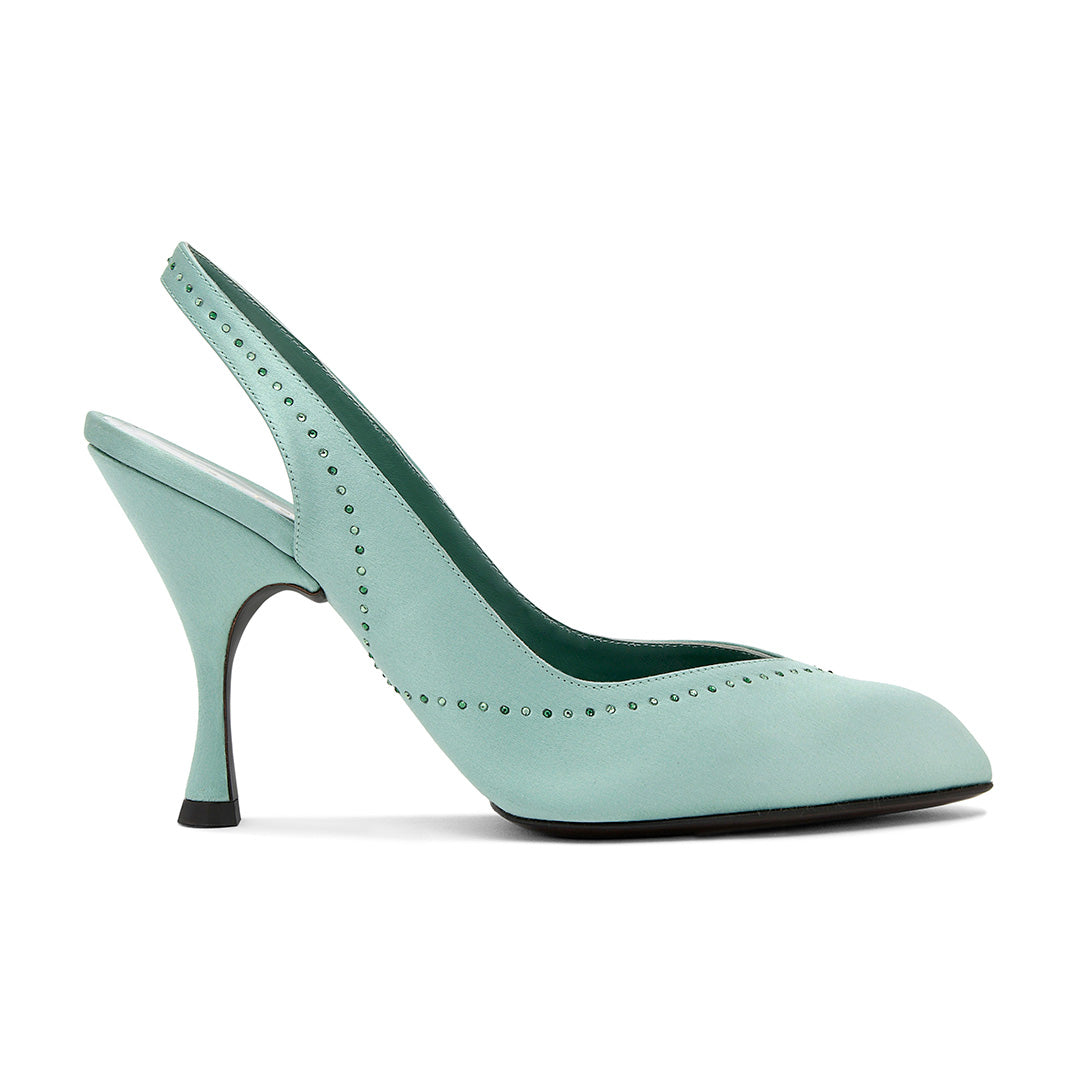 This slingback style, featuring a sole construction from the Herbert Levine archive, creates a look that is both glamorous and sophisticated. The clean, streamlined upper is finished with a precise dusting of crystals for an elevated touch. A leather island sole allows the upper to wrap beneath the shoe, resulting in a refined silhouette.